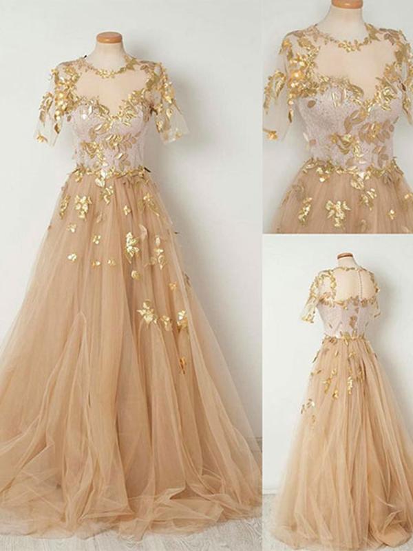 A-Line Gold Prom Dress Tulle Cheap Long Prom Dress,Half Sleeves prom dresses,35