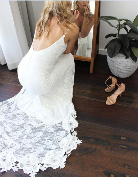 Romantic Boho Backless Lace Mermaid Elegant Ivory Wedding Dress,14
