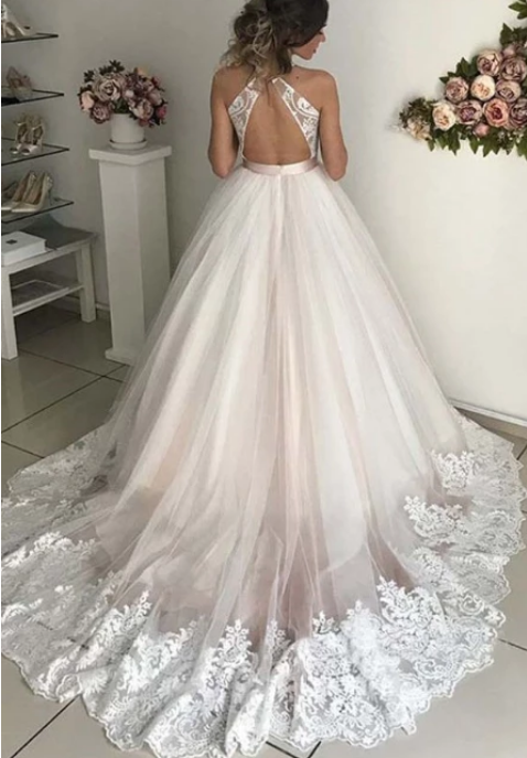 Deep V Neck Sleeveless Backless Wedding Dresses Lace Appliques Bridal Gown,17