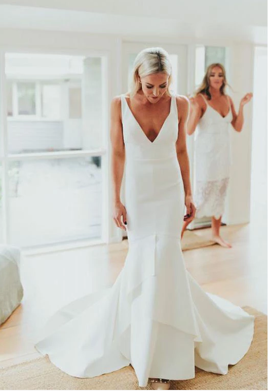 White V Neck Sleeveless Satin Wedding Dresses Mermaid Bridal Dresses,18