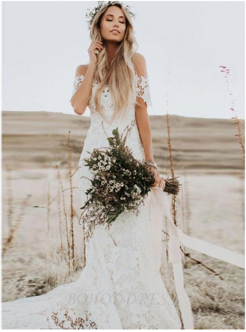 Mermaid Round Neck Short Sleeves Lace Beach Wedding Dress,266
