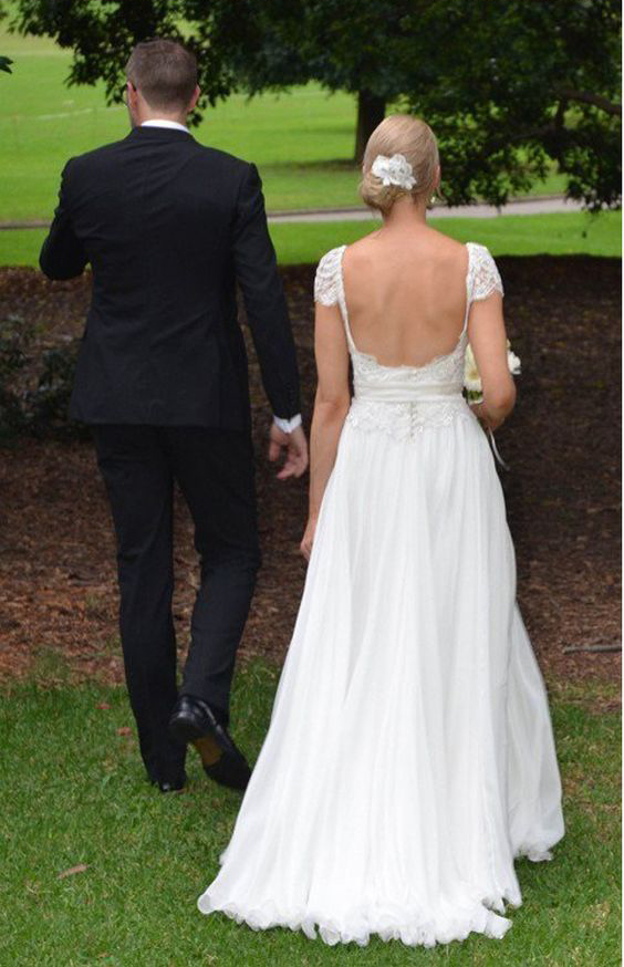 New Arrival Cap Sleeve Lace Bodice Beach Wedding Dress with a Sash,408