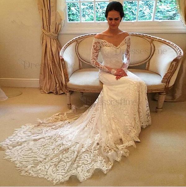 Glamorous Sexy Lace Mermaid Wedding Dress Off-the-Shoulder Tulle Long Sleeves Appliques,1330