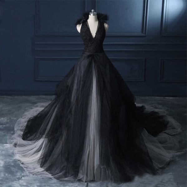 Vintage 2022 Black and White Wedding Dresses Gothic V Neck Sleeveless Lace Appliques Tulle Skirt Bridal Gowns Affordable Wedding Dresses,1435