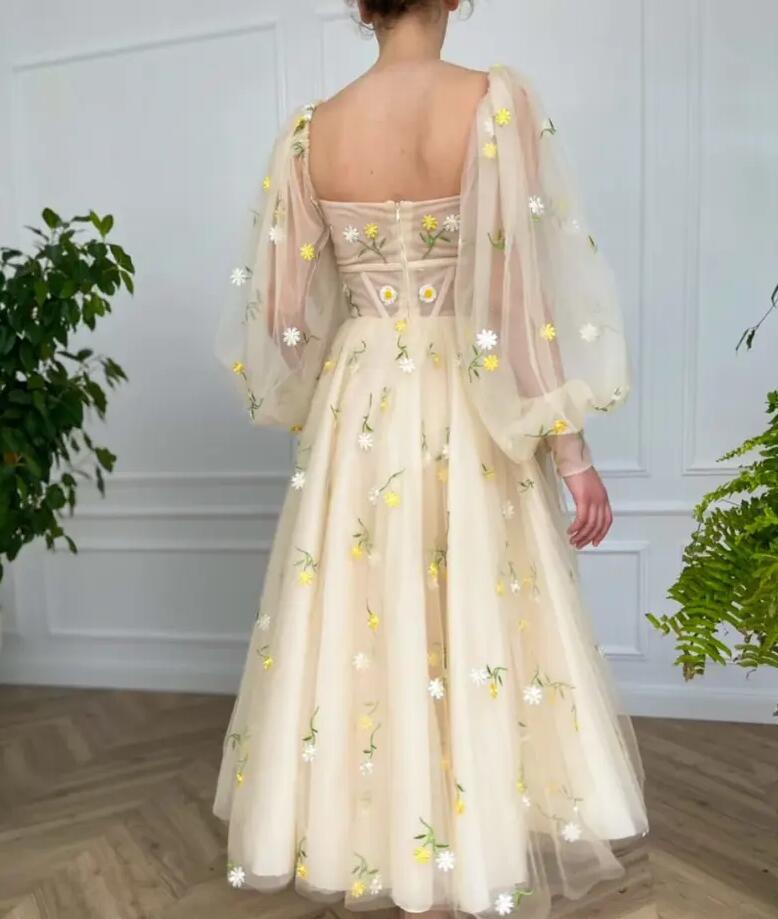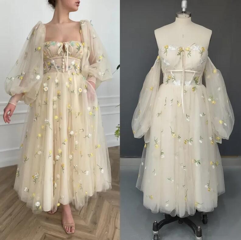 Real Photos Long Puffy Sleeves Flowers Engagement Wedding Gown Birthday Party Dress Prom Evening Dresses For Women,1534