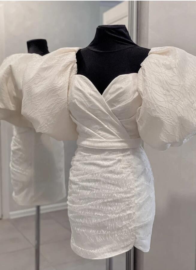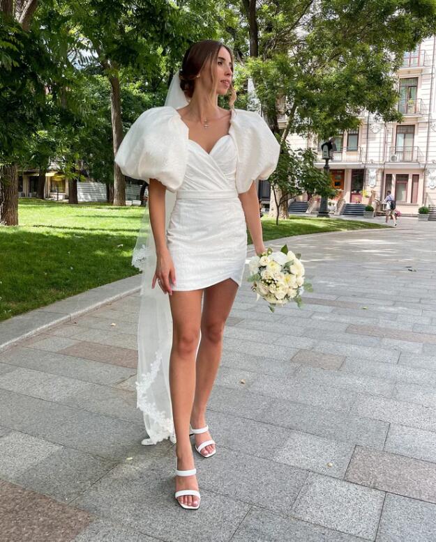 Short wedding dress with puff sleeves Bridal gown mini Wedding dress and veil Short sleeve wedding dress simple,1635