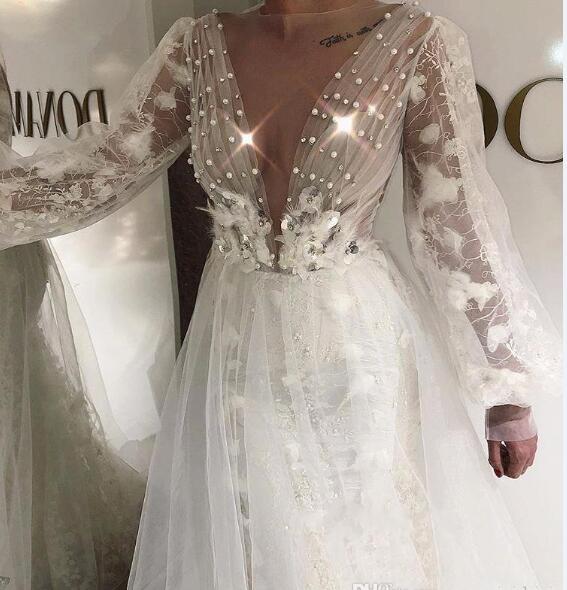 Deep V Neck Wedding Dresses Lace Long Sleeves See Through Bridal Gowns Tulle Covered Mermaid Wedding Vestidos Custom Made,1689