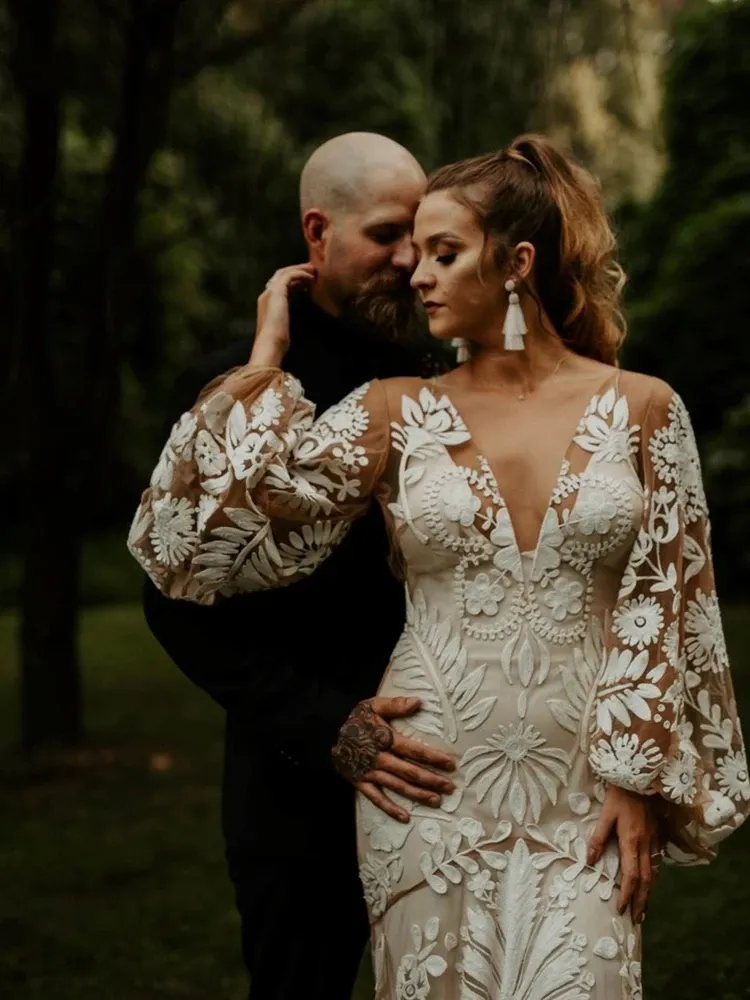 Boho Outdoor Destination mermaid Wedding Dresses Slip Lace Robe Long Sleeves Illusion Backless Elopement bohemain Bridal Gowns,1753