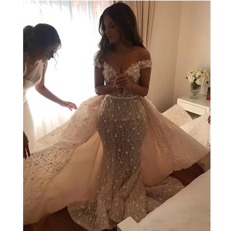 Full Lace Mermaid Wedding Dress With Detachable Train Sexy Off The Shoulder 3D Floral Bridal Gowns,1787