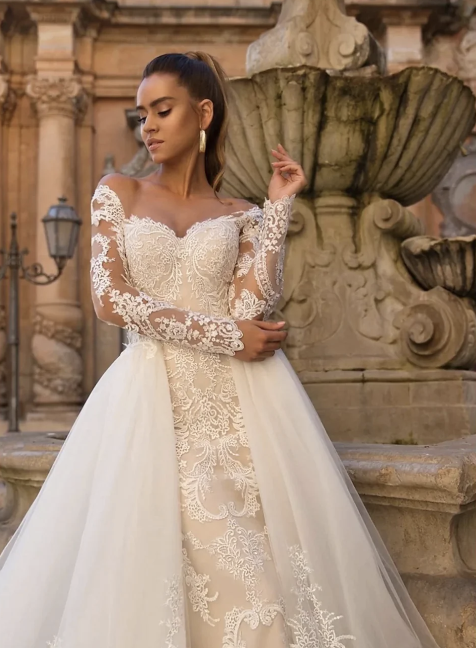 Engagement Open Back Formal Wedding Dresses Two Piece Long Sleeve Lace Appliques,1952