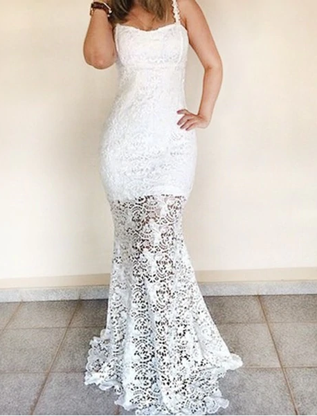 Mermaid Square Sleeveless Long White Lace Prom Dress,37