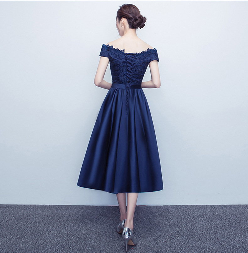 Dark blue lace satin short prom dress, lace evening dress,Homecoming dresses,100
