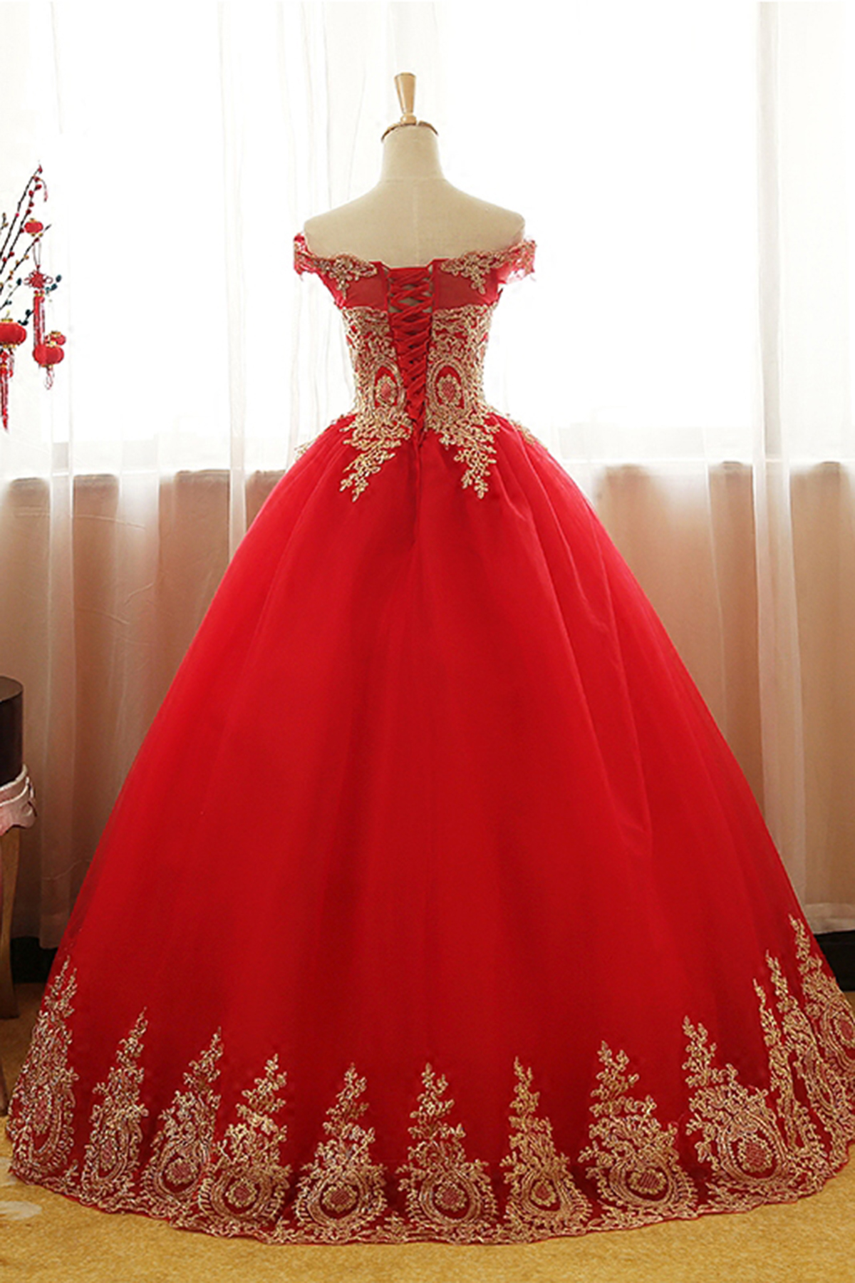 Red tulle long off shoulder formal evening dress with golden appliques,135
