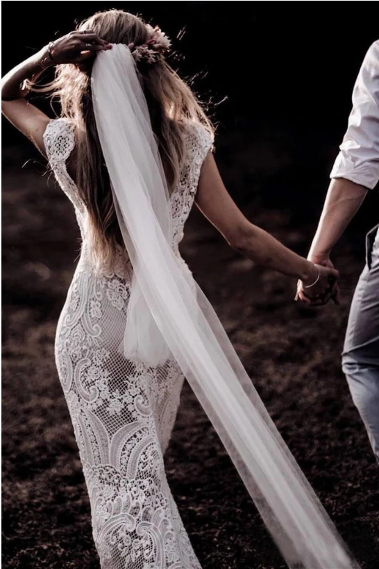 Vintage Lace V Neck Rustic Wedding Dresses Cap Sleeve Ivory Sheath Beach Wedding Gowns,173