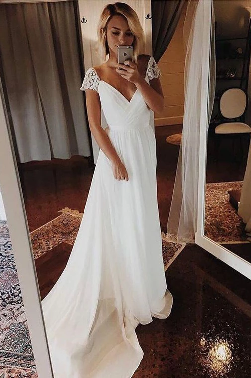 Simple A Line Chiffon Wedding Dresses Cap Sleeve V Neck Bohemian Beach Bridal Gowns,174