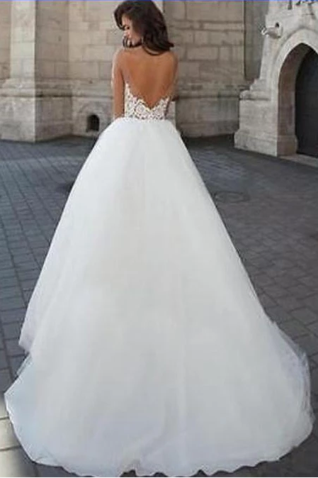 A line Long Sleeve Tulle White Lace Appliques Wedding Dresses Long Wedding Gowns,176