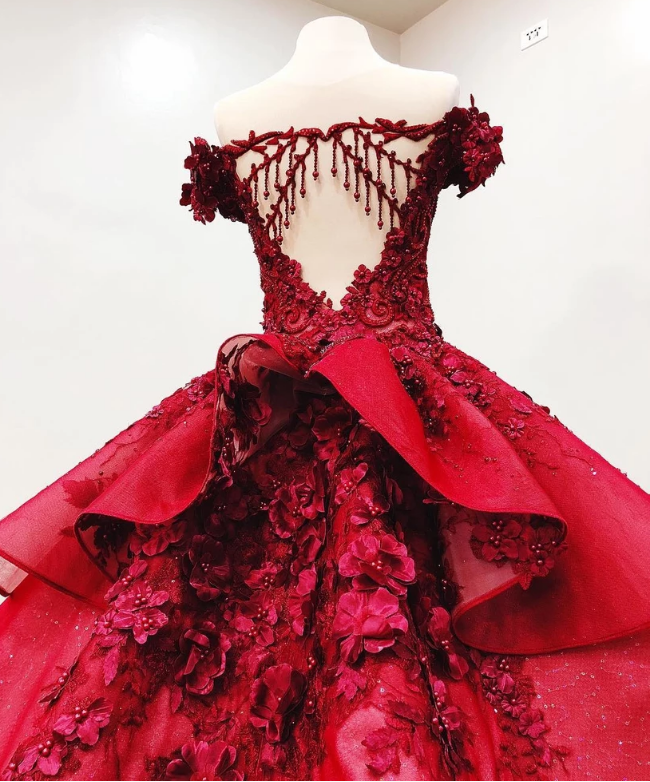 2019 Chic Ball Gown V Neck Beads Appliques Red Off-the-Shoulder Long Prom Dresses,177
