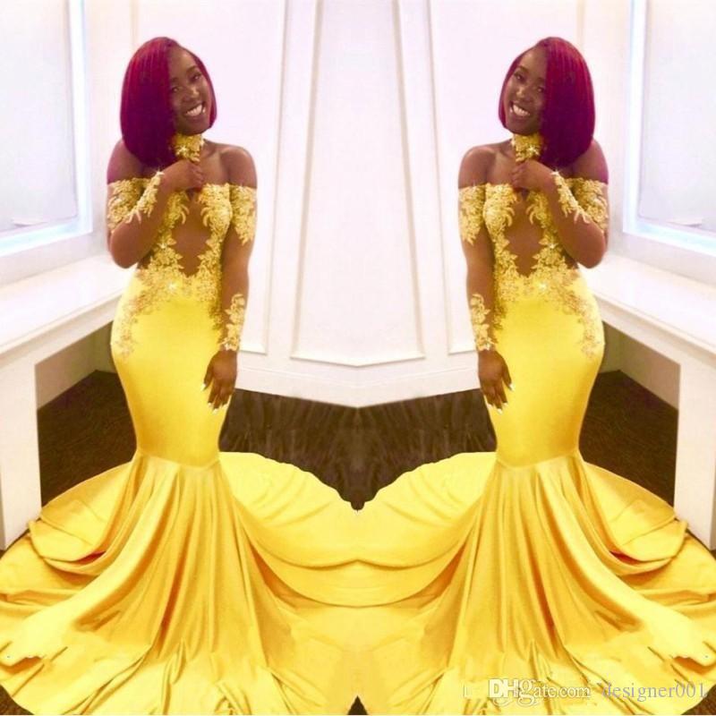 Yellow Lace Long Sleeves Prom Dresses For Black Girls 2019 Appliques Mermaid Evening Dress African Style Sheer Neck Plus Size Party Gowns,227