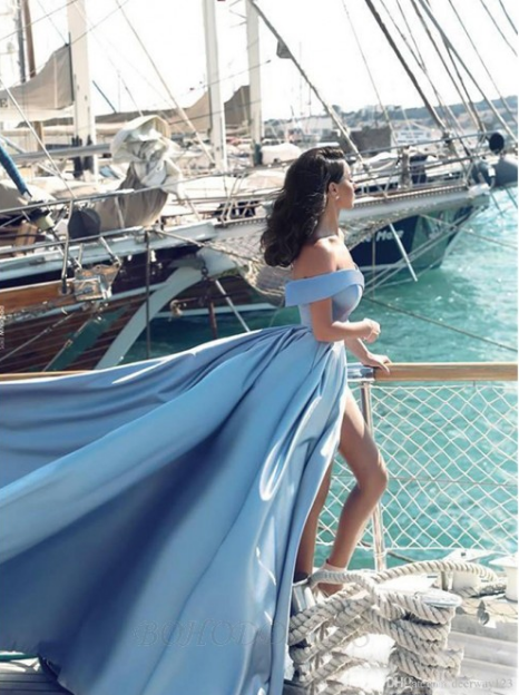 A-Line Off-the-Shoulder Court Train Blue Prom Dress with Split Pockets,254