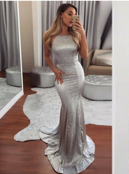 Mermaid Crew Backless Sweep Train Silver Prom Dress with Sequins,269