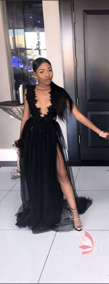Black Deep V Neck Evening Dresses,Tulle Side Slit Prom Dresses,362