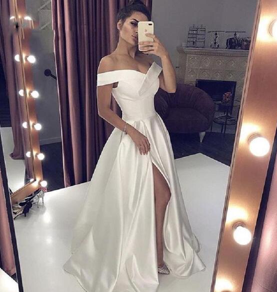 Sexy V Neck Long White Prom Dresses With High Split Elegant A-line Woman Off the Shoulder Special Evening Formal Gowns,464