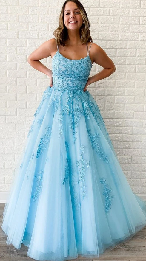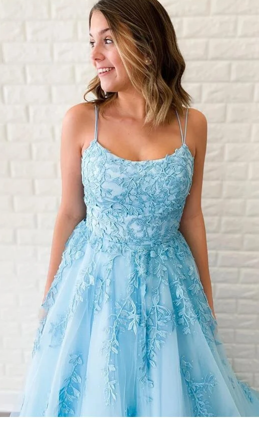 Beautiful A Line Spaghetti Straps Blue Long Prom/Evening Dresses with Appliques,455