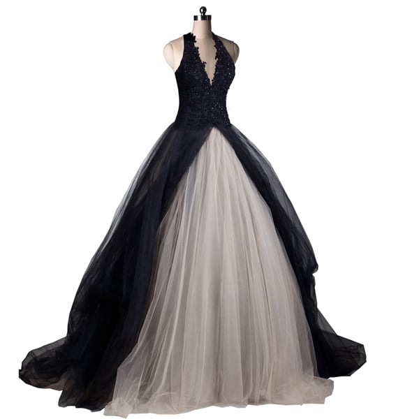 Black and light champagne lace and tulle halter neck beaded wedding dress,524