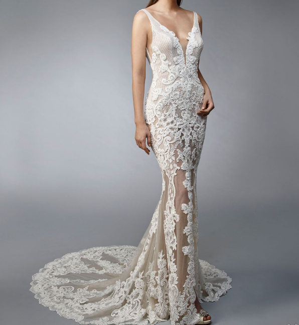 Unique Mermaid V Neck Open Back White Lace Wedding Dresses with Train,577
