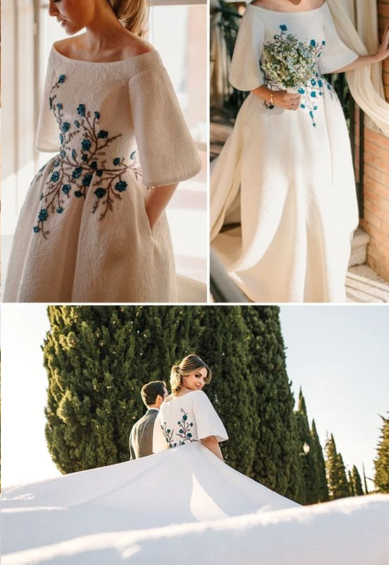 Beautiful Wedding Dresses Bateau Embroidery Romantic Half Sleeve Bridal Gown,593