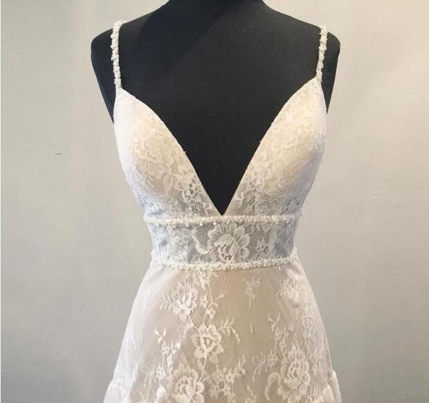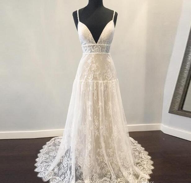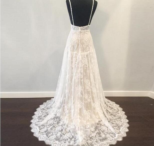Bohemian Wedding Dresses 2019 with Deep V Neck Backless Spaghetti Strap Fully Lace Boho Beach vestido de noiva Empire Waist Sweep Train,605