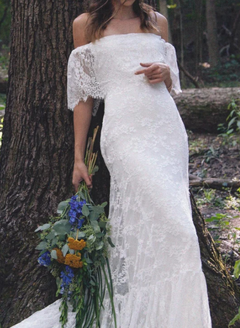 Boho Off-Shoulder Sheath Scalloped Lace Wedding Dress With Long Train,608