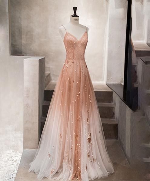 Pink long prom dress spaghetti evening dress v-neck party dress lace tulle formal dress,615