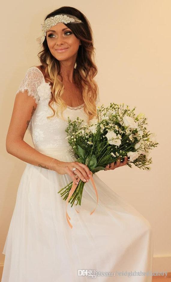 Beautiful Long Ivory Lace Chiffon Beach wedding Dresses,Cheap Wedding Gowns,Cap Sleeves Wedding Gowns,617