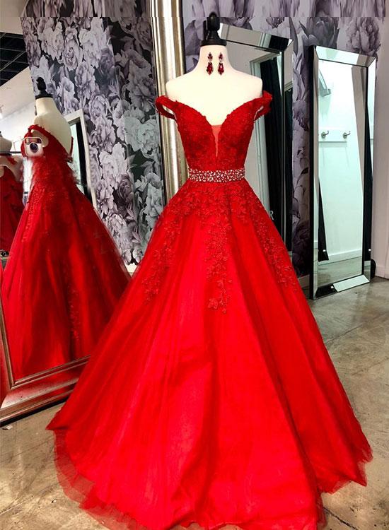 Red Tulle V Neck Off Shoulder Long Beaded Prom Dress, Party Dress,639