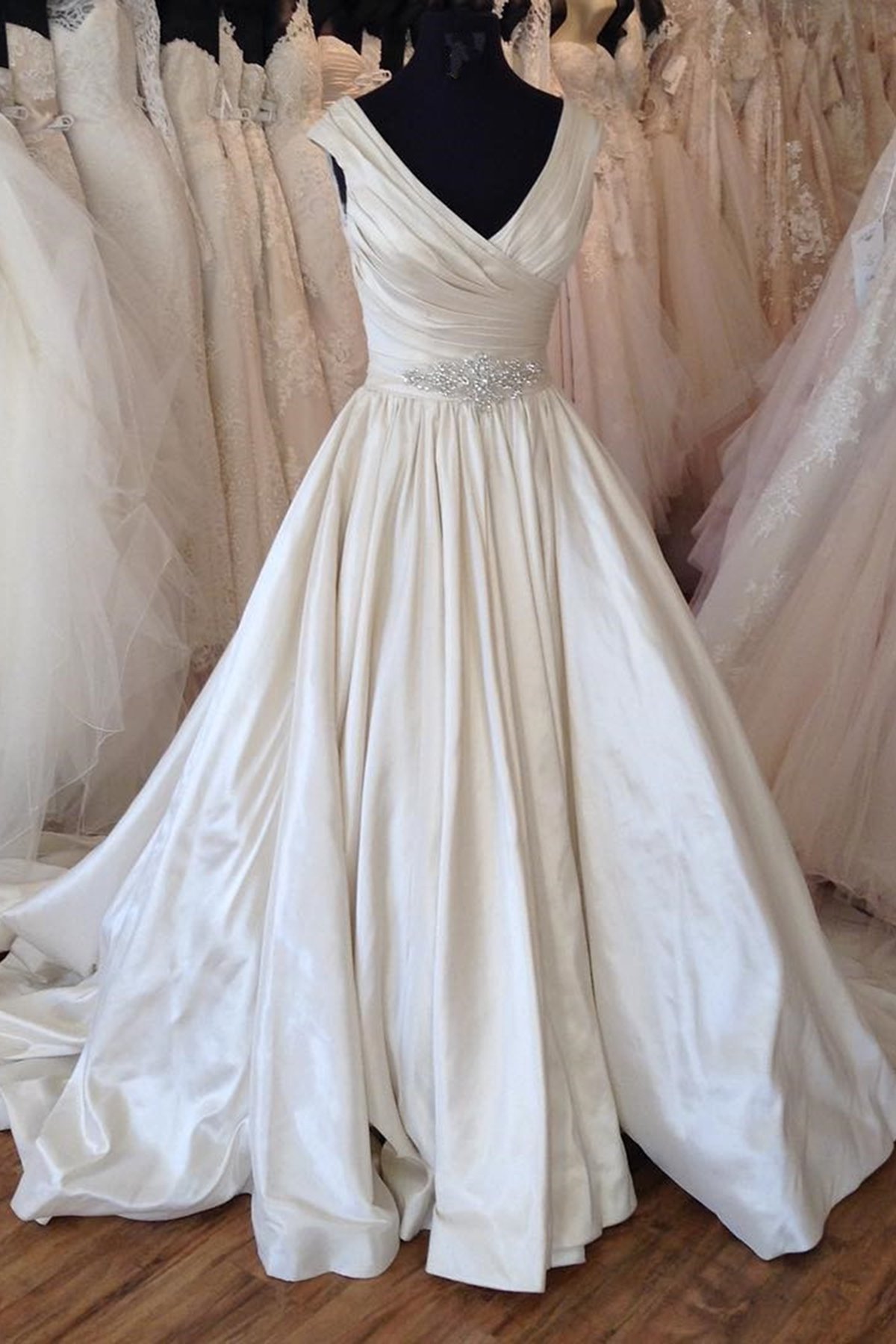 Simple ivory satin V neck customize floor length wedding dress, beaded occasion dress,641