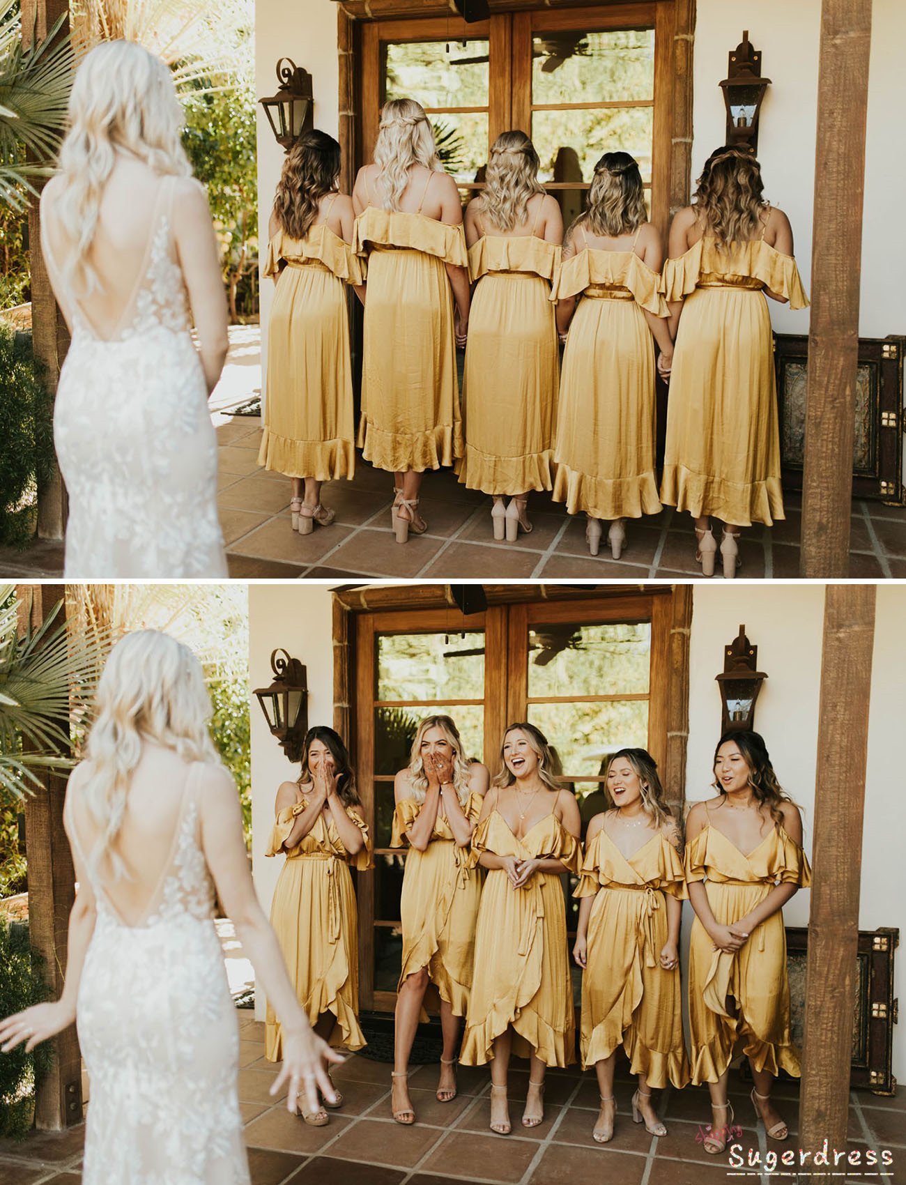 Open Shoulder Hi-Low Gold Bridesmaid Dress with Ruffles,686