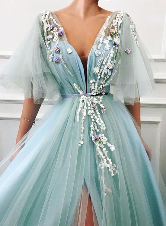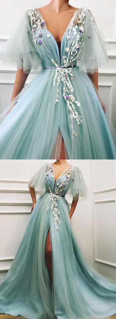 Unique Long Tulle V Neck Lace Cap Sleeve Long Prom Dress, Evening Dress,719