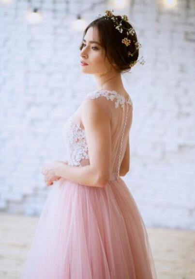 New Blush Pink Bohemian Wedding Dresses Illusion Neck White Lace Appliqued Long Tulle Beach Bridal Gowns,775