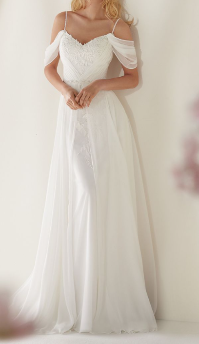 White Chiffon Lace Appliques Wedding Dress Off Shoulder Spaghetti Straps Sheath Bridal Dress Long Prom Dress,824