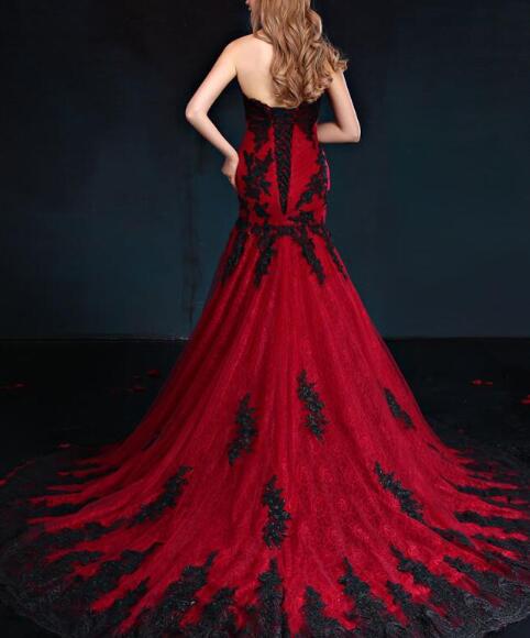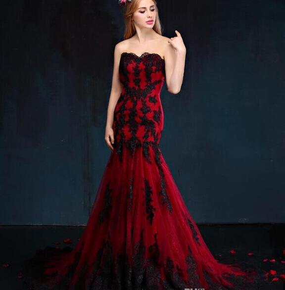 Black And Red Gothic Mermaid Wedding Dresses Sweetheart Lace Appliques Tulle Corset Back Vintage Colorful Wedding Gowns 1950s,828