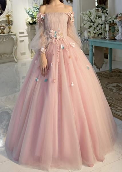 Long Sleeve Off Shoulder Formal Evening Dress Pink Flowers Tulle Princess Prom Dresses Plus Size Party Gowns,833