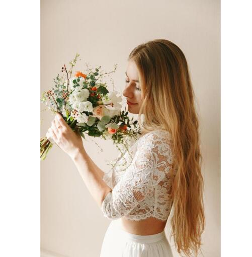 Boho Draped Floor Length Bridal Gowns Simple Plus Size 3/4 Long Sleeve Chiffon Lace Appliques Two Pieces Wedding dress,841