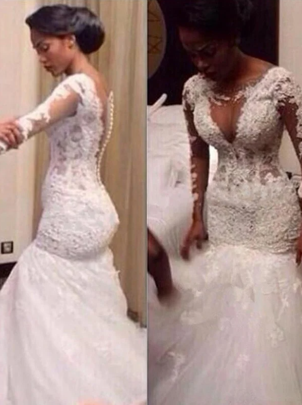 Trumpet/Mermaid V-neck Long Sleeves Lace Floor-Length Tulle Wedding Dresses,887