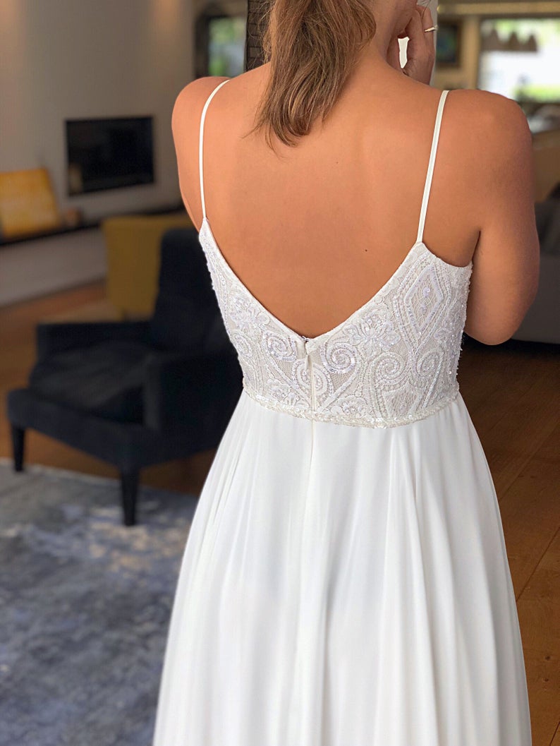 White Wedding Dress with Slit, Lace Spaghetti straps Wedding Dress, V neck Open Back Beaded Wedding Dress, Beach Wedding Dress,906