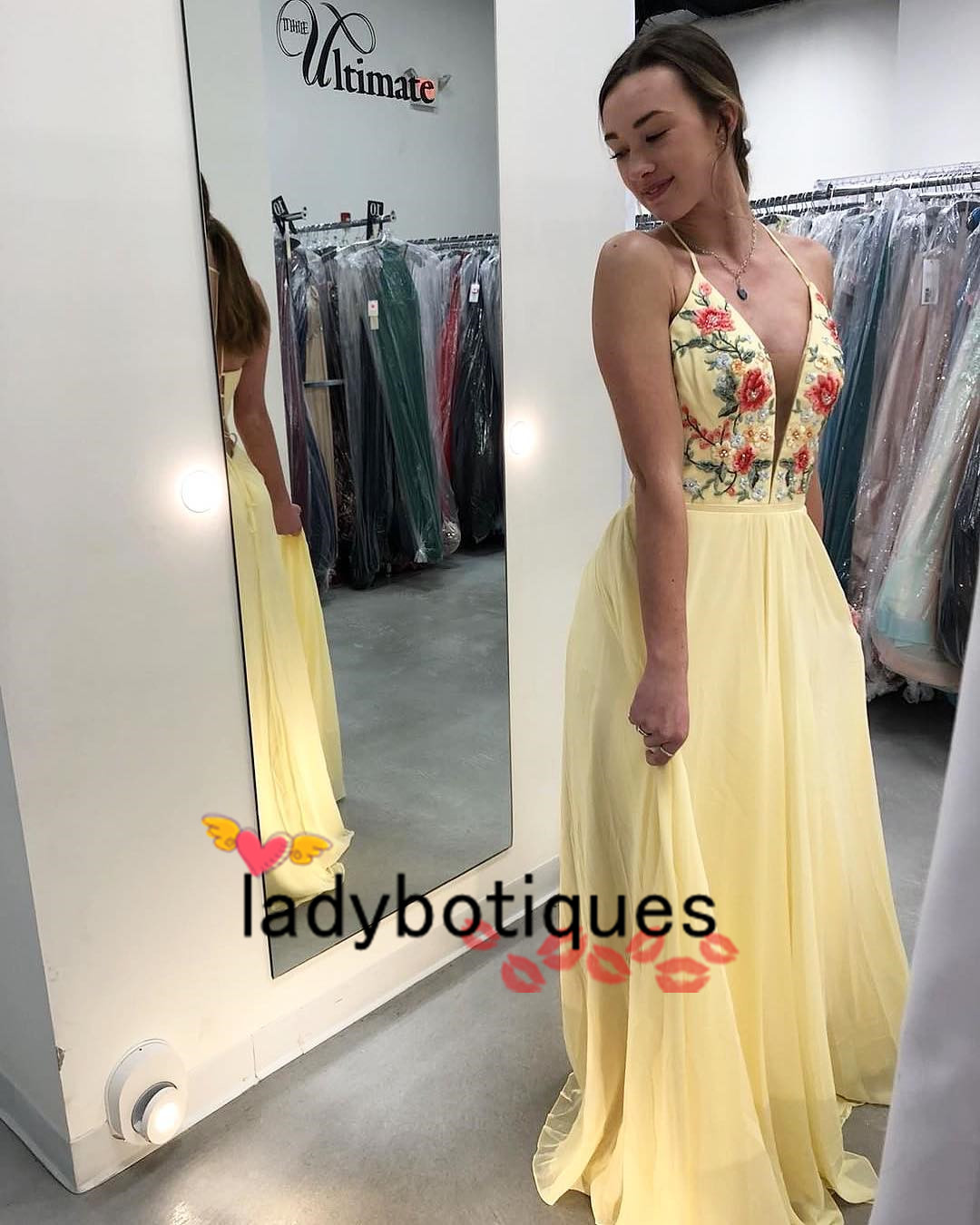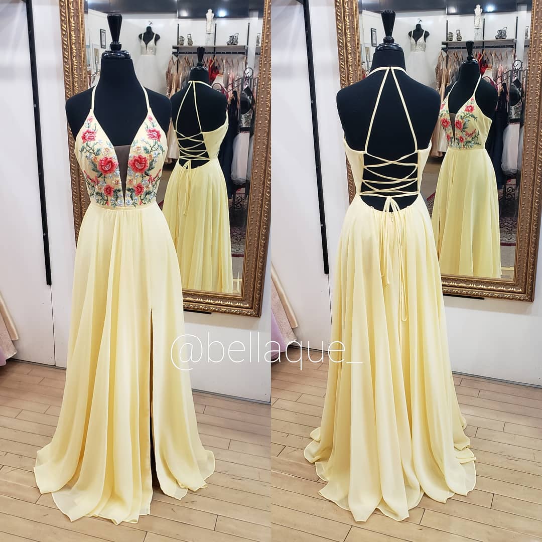 Yellow Long Prom Dress with Floral Embroidery,911