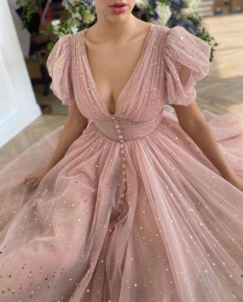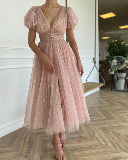 Custom Made Blush Pink Tulle Ankle Length Prom Evening Dresses,Starry Night Gown,917