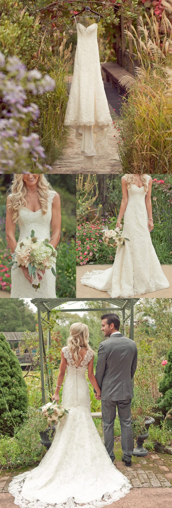 Vintage Lace Cap Sleeves A-line Wedding Dress, Trumpet Lace Appliques Long Bridal Gown, Covered Button Court Train Satin Wedding Dress,957