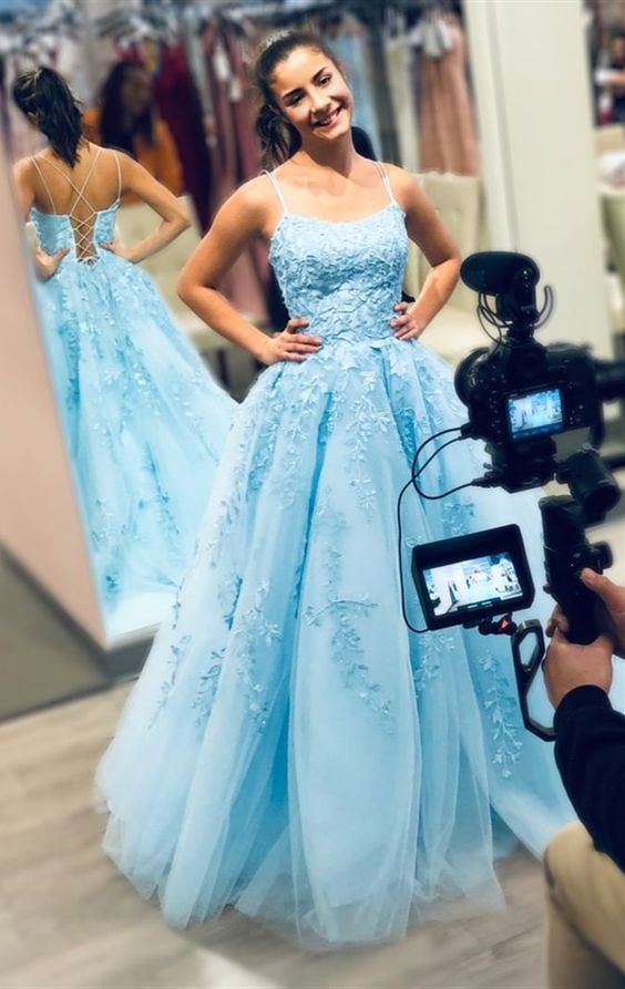 A Line Spaghetti Straps Appliques Tulle Prom Dresses,Graduation Dance Dress,959