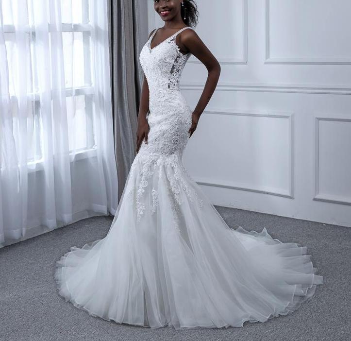 Lace Mermaid V-Neck White Wedding Dress 2021 Appliques,963